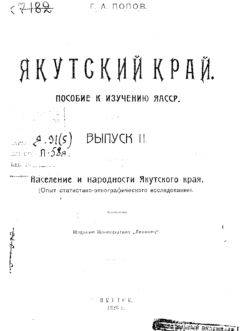 Попов Г.А. Якутский край. Пособие к изучению ЯАССР. Выпуск 2. Якутск, 1926