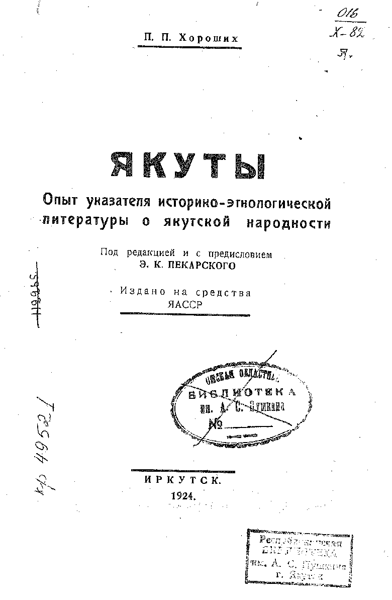 Хороший П.А. Якуты. Опыт указателя историко-этнологической литературы о якутской народности. - Иркутск, 1924