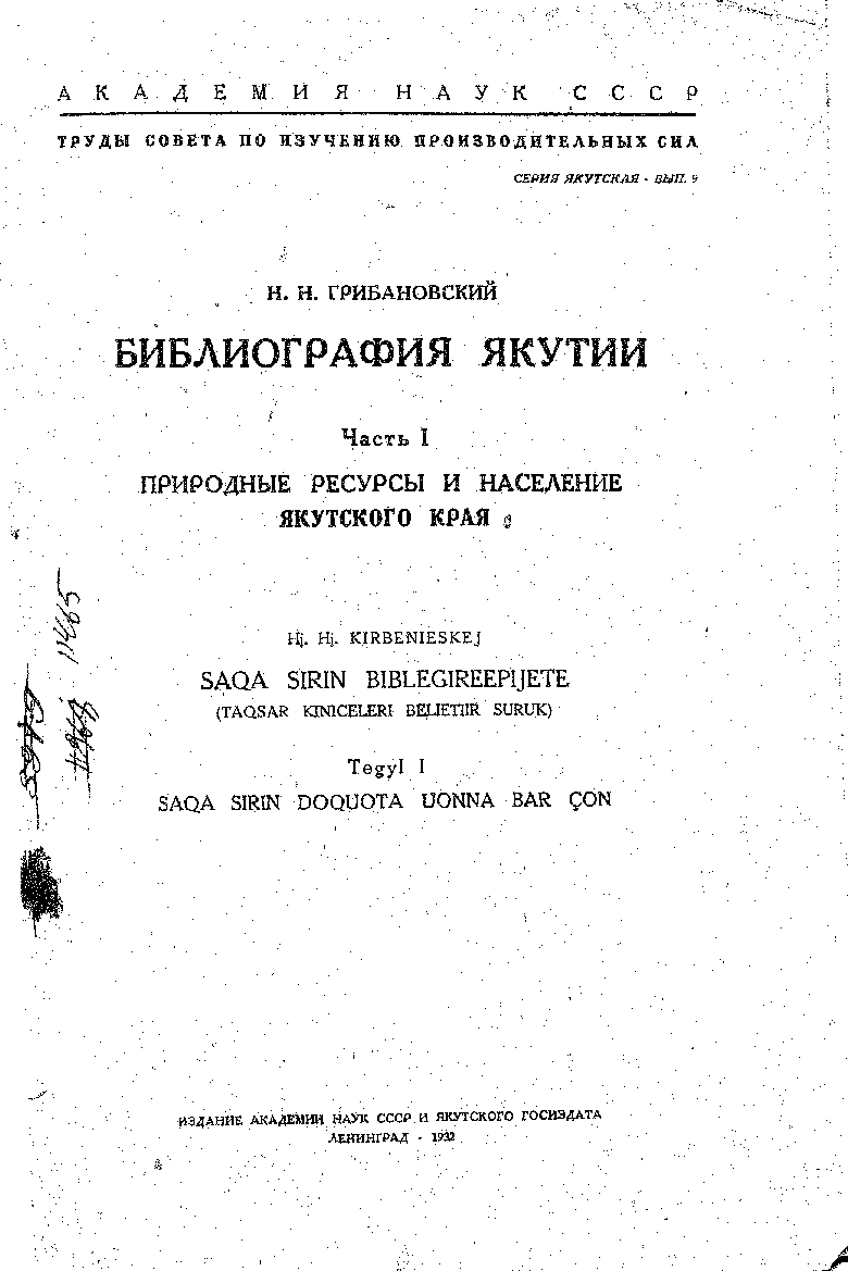 This is the HTML version of 63-60. Грибановский Н.Н. Библиография Якутии. Часть 1. Природные ресурсы и население Якутского края. Санкт-Петербург, 1932 Page 1