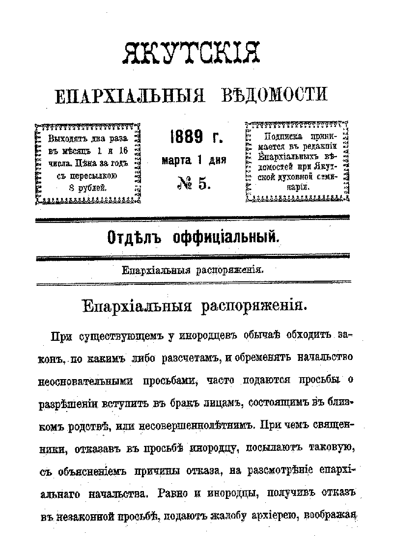 This is the HTML version of 73-1129. Якутские епархиальные ведомости - 1889. - №5 Page 1