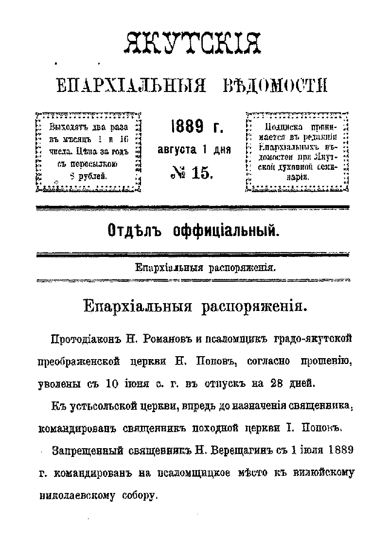 This is the HTML version of 73-1150. Якутские епархиальные ведомости - 1889. - №15 Page 1