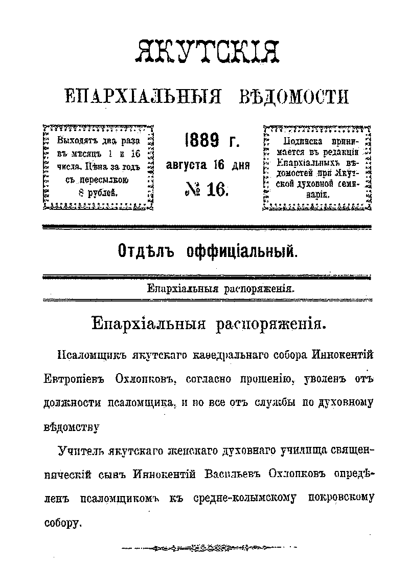 This is the HTML version of 73-1151. Якутские епархиальные ведомости - 1889. - №16 Page 1