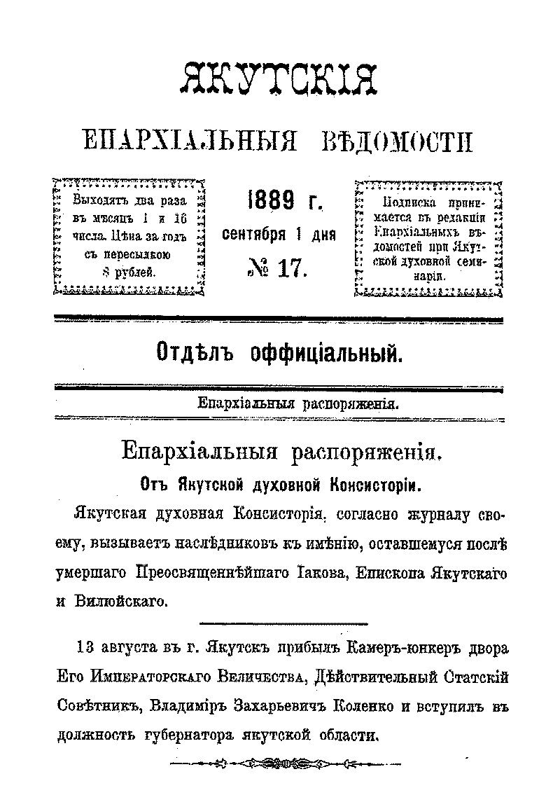 This is the HTML version of 73-1156. Якутские епархиальные ведомости - 1889. - №17 Page 1
