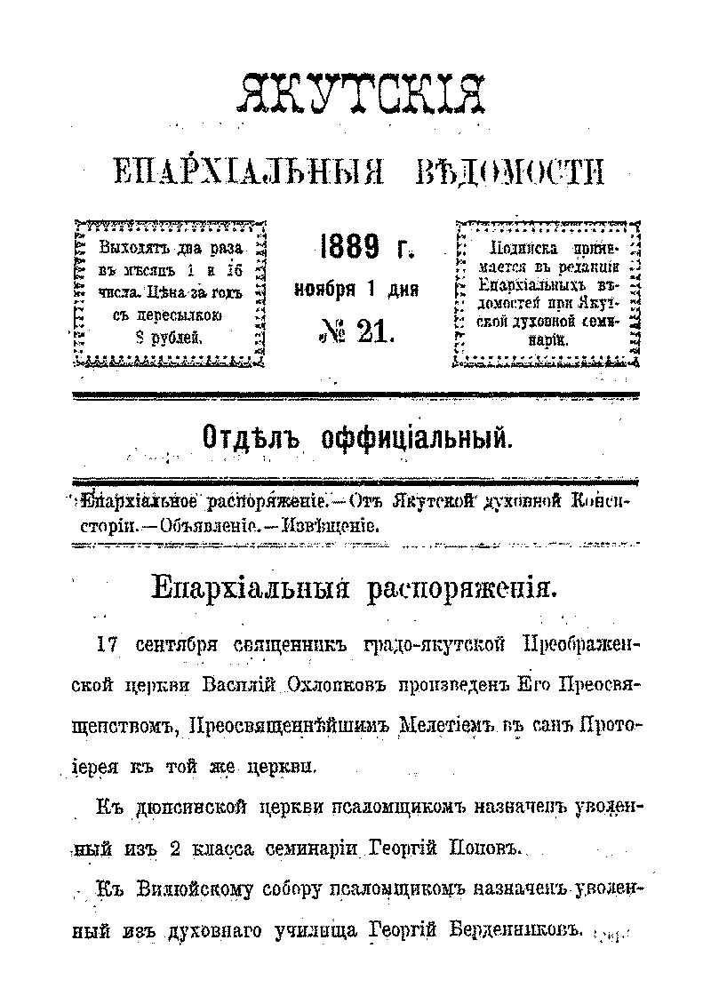 This is the HTML version of 73-1164. Якутские епархиальные ведомости - 1889. - №21 Page 1