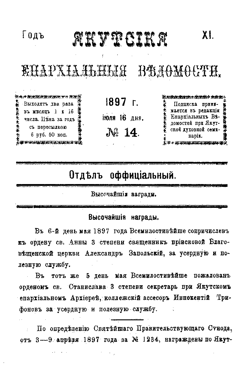 This is the HTML version of 73-1167. Якутские епархиальные ведомости - 1897. - №14 Page 1