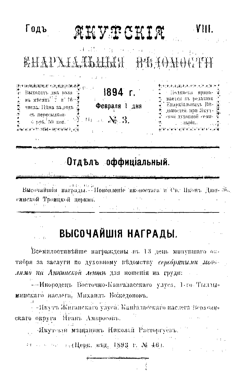 This is the HTML version of 73-1392. Якутские епархиальные ведомости - 1894. - №3 Page 1