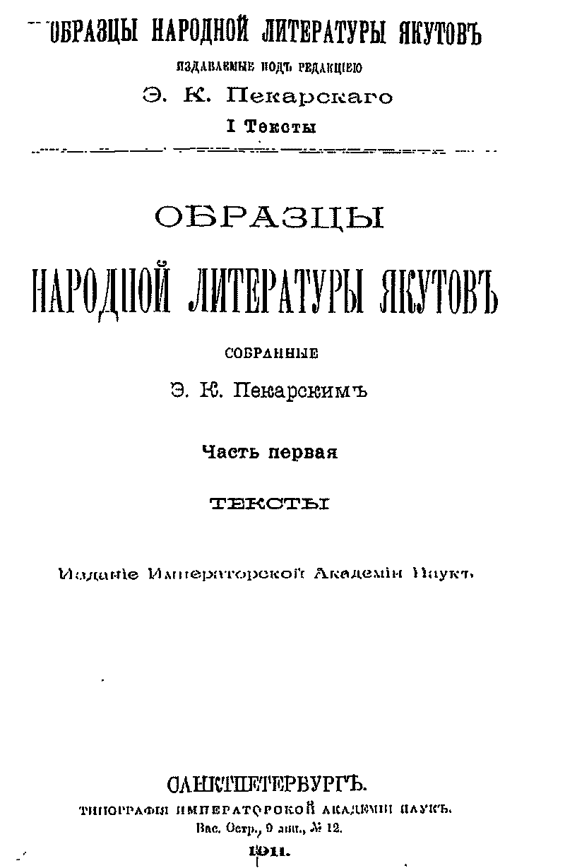 This is the HTML version of 8-1622. Образцы народной литературы якутов: Т. 1. Вып. 5. 9) Уут аас бэйэлээх Урунг-айыы-тойон ыччаттара; 9) Орто дойдуга ороhулаан тереебут Орой-Хара аттаах О5о-Тулаайах; 11) Елуу-Уедулбэ-бухатыыр; 12) Аландаайы-Куландаайы-Кулун-Куллуруускай; 13) Чаарчахаан; 14) Чурум-Чурумчуку; 15) Чыычаах икки моєус икки; 16) Тиин-о5онньор икки Танас-Кыйат икки; 17) Ус брааттыылар; 18) Кириисэлиир Кирилэ; 19) Хара-холорукай балыстаах Эр-Соєотох; 20) Эриэдэл-бэргэн; 21) ОлоЅхолоон-обургу – 1911. – 476 с. Page 1