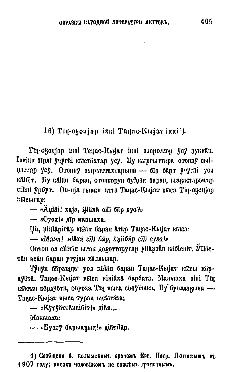 This is the HTML version of 8-1622. Образцы народной литературы якутов: Т. 1. Вып. 5. 9) Уут аас бэйэлээх Урунг-айыы-тойон ыччаттара; 9) Орто дойдуга ороhулаан тереебут Орой-Хара аттаах О5о-Тулаайах; 11) Елуу-Уедулбэ-бухатыыр; 12) Аландаайы-Куландаайы-Кулун-Куллуруускай; 13) Чаарчахаан; 14) Чурум-Чурумчуку; 15) Чыычаах икки моєус икки; 16) Тиин-о5онньор икки Танас-Кыйат икки; 17) Ус брааттыылар; 18) Кириисэлиир Кирилэ; 19) Хара-холорукай балыстаах Эр-Соєотох; 20) Эриэдэл-бэргэн; 21) ОлоЅхолоон-обургу – 1911. – 476 с. Page 464