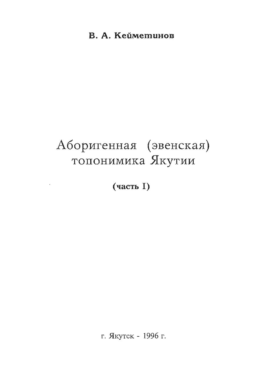 This is the HTML version of 90-33. Кейметинов В. А. Аборигенная (эвенская) топонимика Якутии. Якутск, 1996 Page 1