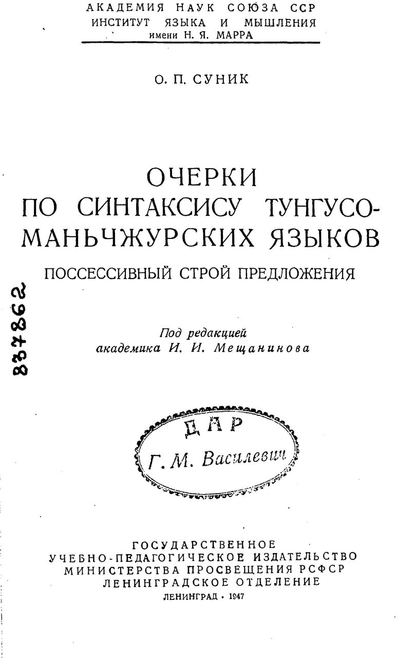 This is the HTML version of 91-112. Суник О. П. Очерки по синтаксису тунгусо-маньчжурских языков. Ленинград, 1947 Page 1
