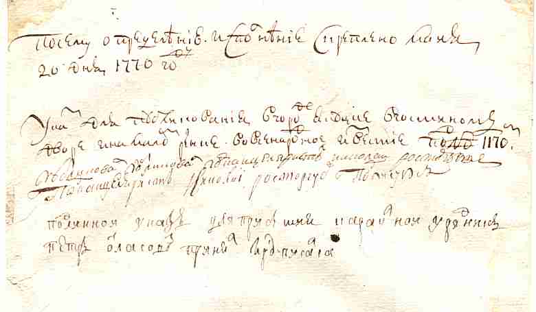 По указу иркутской губернской канцелярии о лишении всех чинов бывшего лейб-гвардии Преображенского полку из курьеров отставного подпоручика Н.Поднинского за подложную продажу разного звания беглых людей. 1770 год